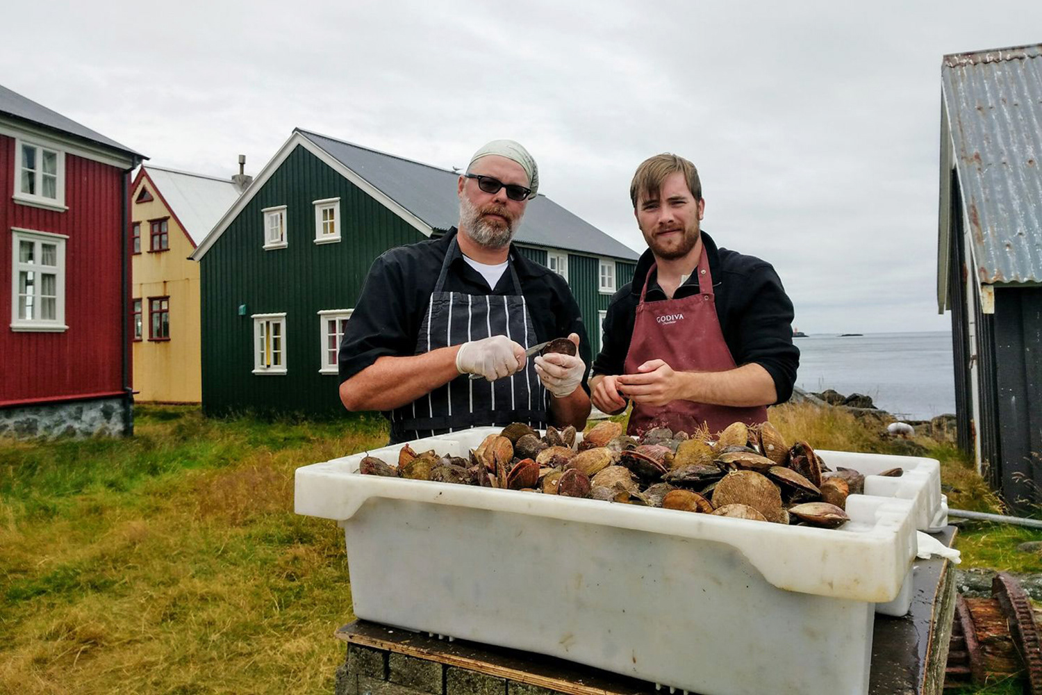Chef Friðgeir Helgason (left) shucks scallops at Hótel Flatey with Haukur, maître d'hôtel.